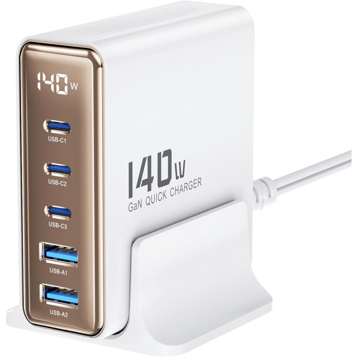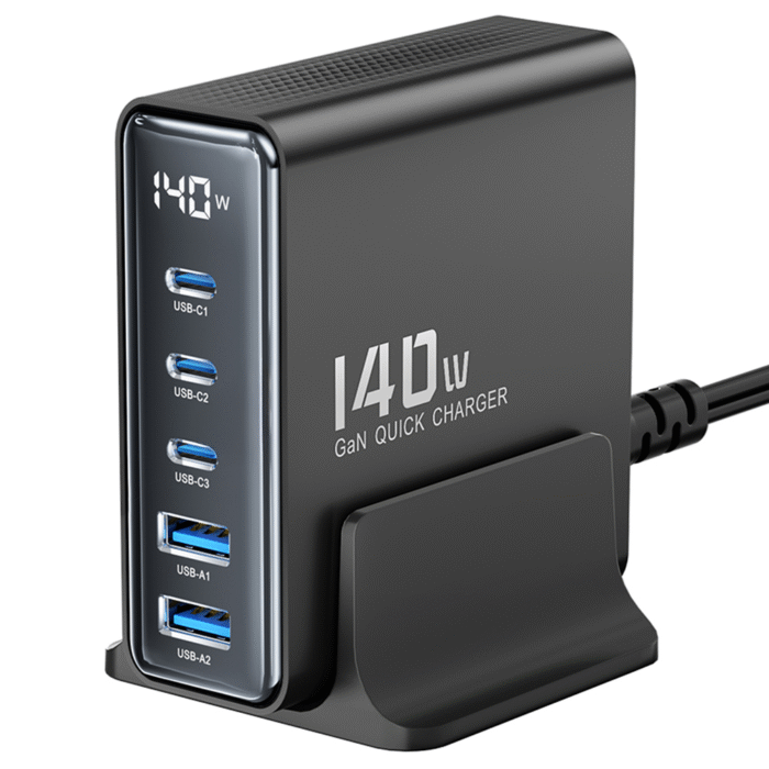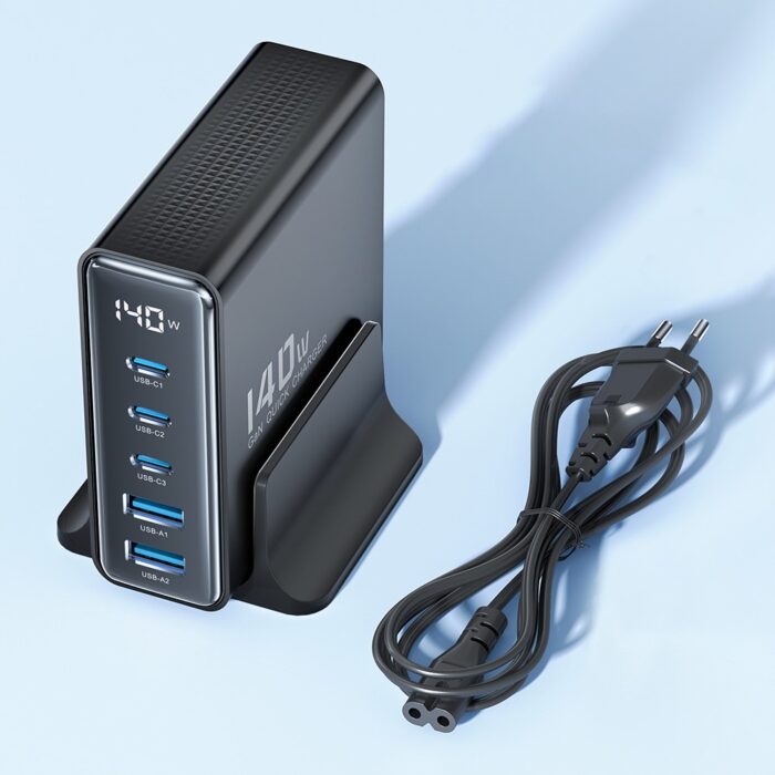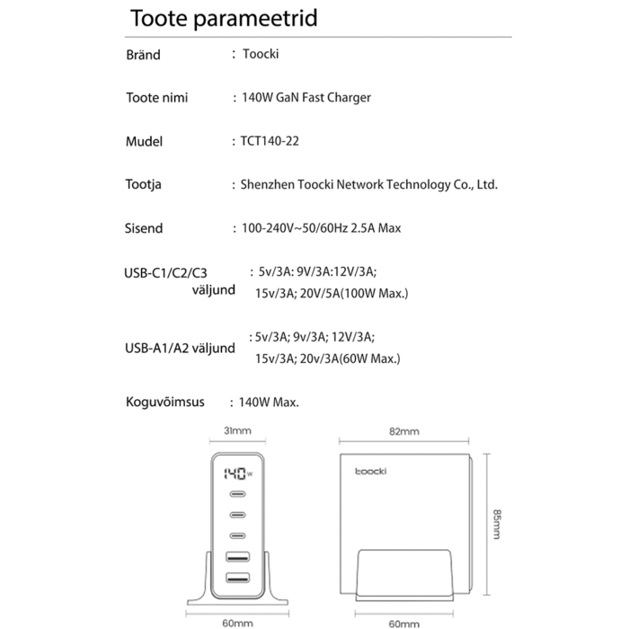 Toocki TCT140‑22 on mitmeportiline GaN‑tehnoloogial põhinev laua/pistiklaadija, mis on mõeldud mitme seadme korraga kiireks laadimiseks.